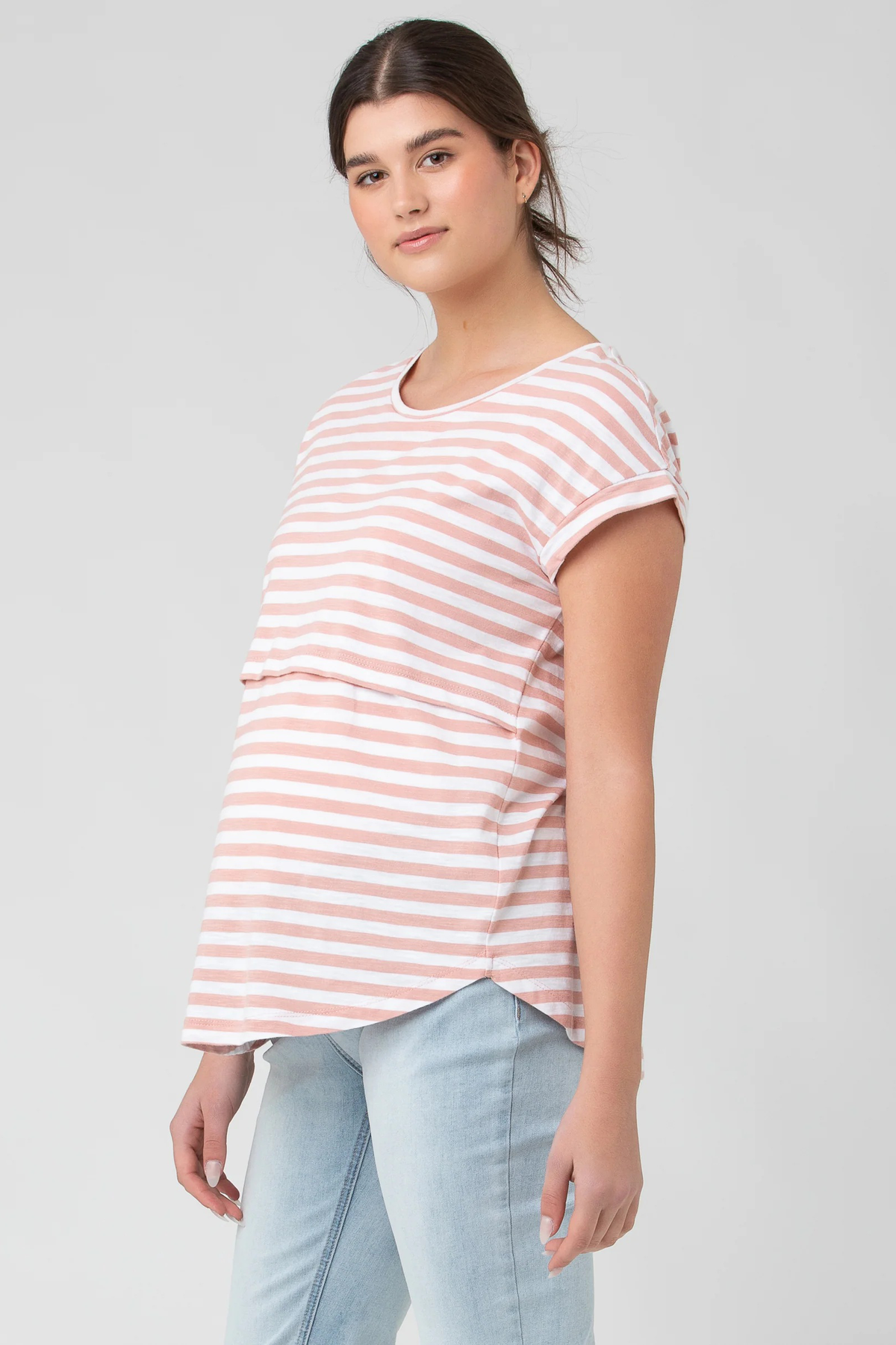 Because stripes never go out of style. Our Lionel Nursing Tee in Peachy Pink is a best-seller for a reason! Specifically designed to ensure enough drape over your bump, it is as practical as it is soft and comfortable. You'll be living in this elevated basic throughout your pregnancy and beyond with it is discreet nursing access. Paired with our Hunter "Mom" jeans.